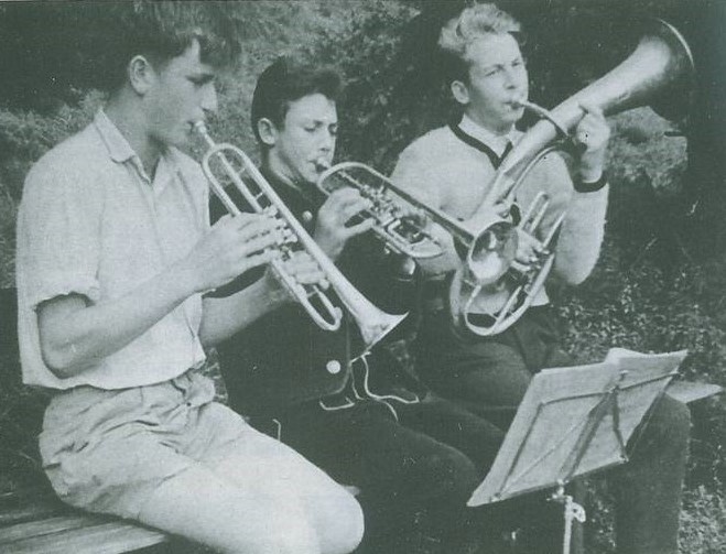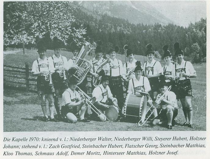 Da dieser spontan einwilligt, geht es sofort mit sehr viel Fleiß und Ehrgeiz an die Arbeit. Bald schon entlockt der Hias seinem Tenorhorn recht ordentliche Töne, von diesen werden weitere „Interessenten „ angelockt und so kommt es, dass Josef Egger und Hubert Steinbacher sich mit Trompeten dazugesellen. Nun sind Eifer und Ehrgeiz besonders groß und jeden Sonntag trifft man sich beim Thomas im Jagdhaus zum Proben.