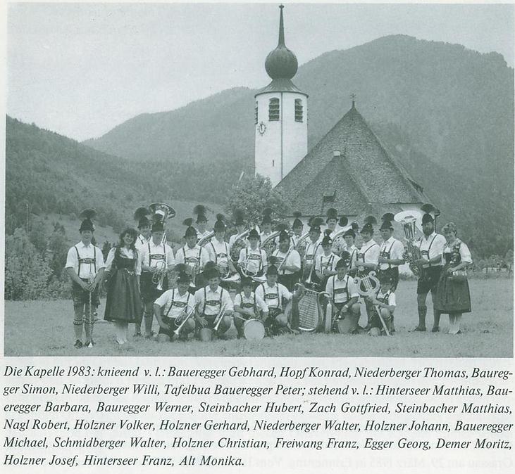 Im Jahr 1979 kristallisiert sich aus der Kapelle ein besonderes „Trio“ heraus, die Weißbacher Alphornbläser. Werner Bauregger, Matthias Steinbacher und Walter Niederberger werden auserkoren, diese Alphörner zu spielen, was, wie sich bald herausstellte, nicht so ganz einfach war. Aber die drei bewältigten die Anlaufschwierigkeiten und beim Trachtenjahrtag 1979 war der erste Auftritt zu verzeichnen.