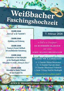 Nach so langer Pause gibt’s in Weißbach endlich wieda a Faschingshochzeit! Und bei dem bunten Treiben der Maschkera-Leid derf a gscheide Musik natürlich ned fehlen!